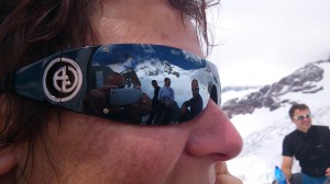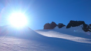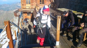 Ve čtvrtek jsme pak po sedmé hodině vyrazili na záverečný stěžejní útok. Po již známém svahu jsme vystoupali nahoru do sedla a následně pokračovali stále nahoru až na Zumsteinspitze 4.563 m n.m., což byl pro spoustu lidí výškový rekord a tak jsme se mohli těšit na oslavné Rádlery. Výhledy byly na celé Alpy a i se aspoň trošku utišil ten otravný ostrý vítr. Pak jsme krátce sestoupili dolů a stoupali znovu nahoru na Signalkuppe 4.554 m n.m. Těsně před příchodem nad námi začal kroužit vrtulník s nákladem jídla a tak tak, že Pan Dan